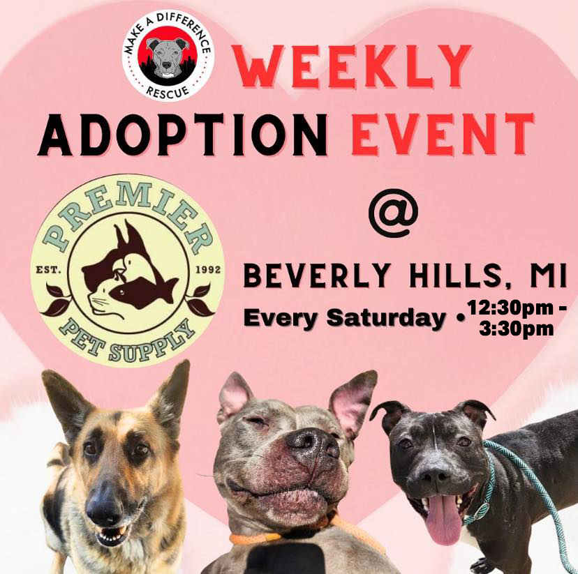 Come to our adoption events! We hold an adoption event weekly on Saturday at Premier Pet Supply in Beverly Hills, MI from 12:30pm-3:30pm! If there is a specific dog that you would like to meet, please contact us to make sure that they can come. Due to the high volume of adoptable dogs and limited space at the events, every dog does not come to every event, so to avoid disappointment, please message us in advance.